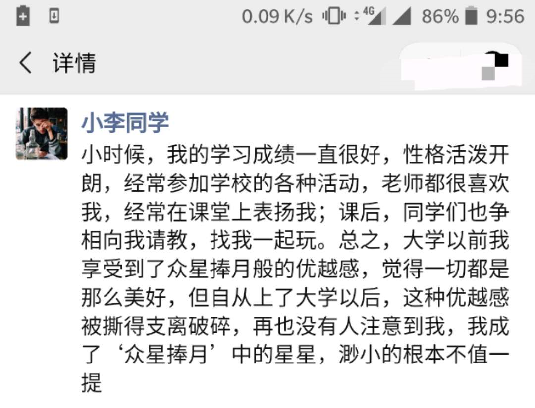 马同学可谓把入学的怀旧情绪发挥到了极致,对马的思念变成了现实。虽然,大部分新生并没有像马同学一样把怀旧情绪转化为现实行为。但也有很多同学经常会发出感慨。比如小王同学: