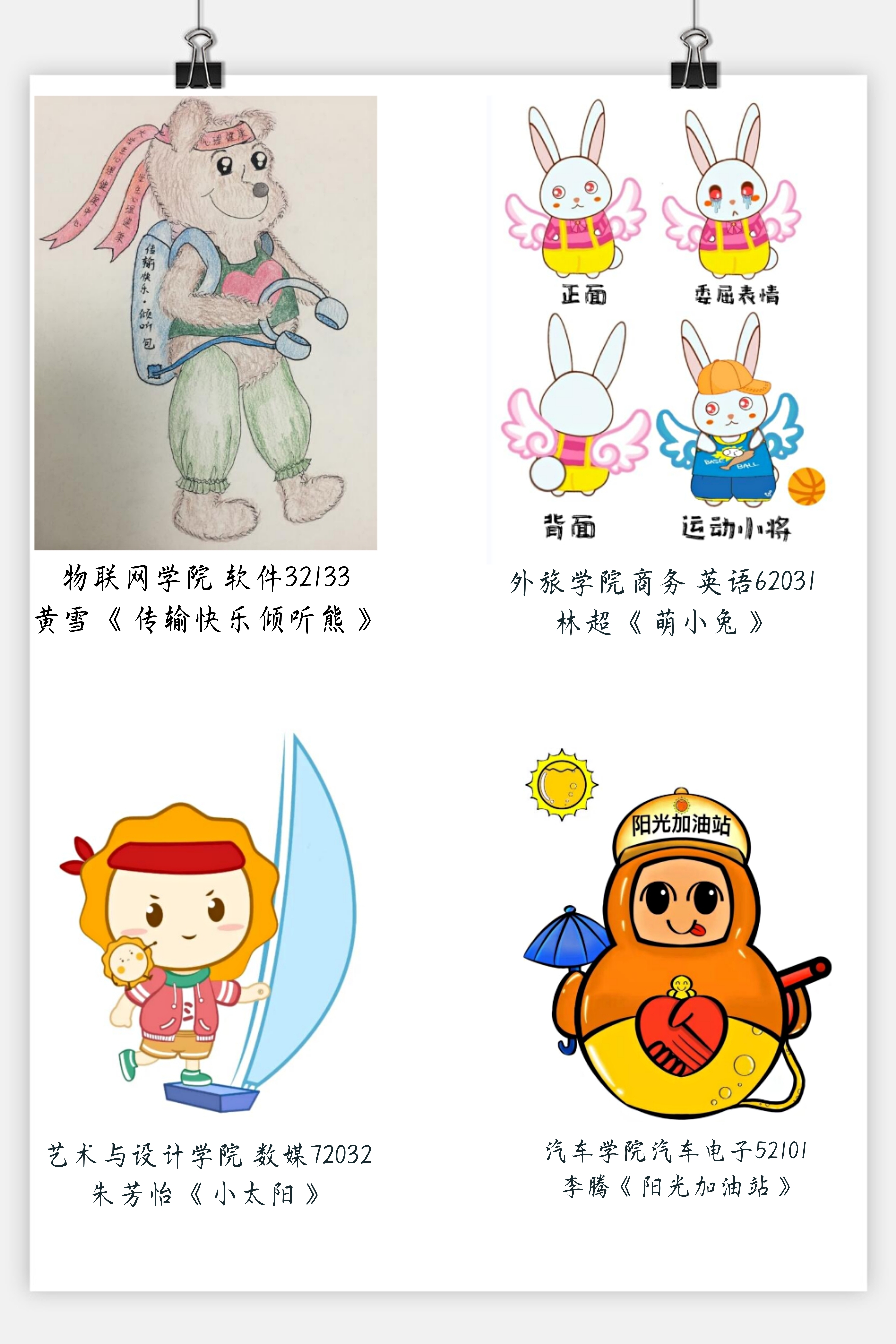 历经2月时间,活动最终收到来自各院系同学作品40余件,经心理中心组织评审,最终设计学院数媒72032朱芳怡的《小太阳》、物联网学院软件32133黄雪的《传输快乐倾听熊》、外旅学院商务英语62031林超的《萌小兔》等三个作品获得一等奖;汽车学院汽车电子52101李腾的《阳光加油站》等四项作品获得二等奖;活动另评出四个三等奖及六个优秀奖。设计艺术学院、汽车与交通学院获得优秀组织奖。