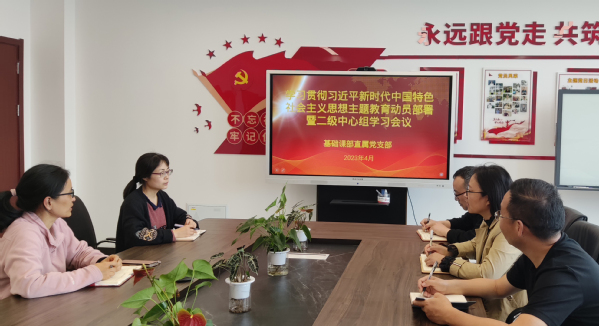 4月28日,基础课部直属党支部在崇德楼804召开学习贯彻习近平新时代中国特色社会主义思想主题教育动员部署会议暨二级中心组理论学习会,会议由直属党支部副书记王兰主持,支部全体支委参加了会议。