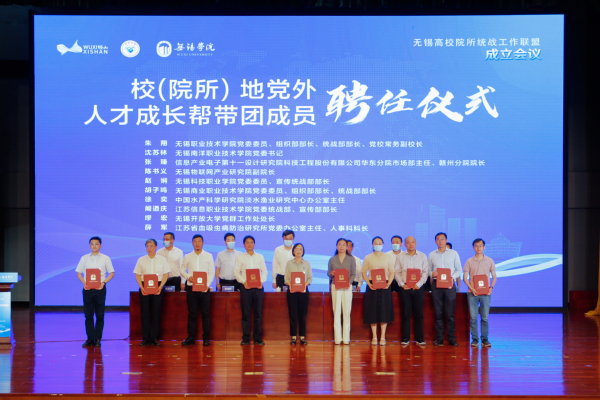 我校党委委员、党委统战部部长朱翔作为代表,现场受聘“校(院所)地党外人才成长帮带团”团员;校侨联主席、机械技术学院副院长、九三学社无锡职院支社宣传委员、无锡侨智创新中心执行主任俞张勇受聘“校(院所)地合作专家团”团员。