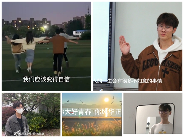 在原创短视频比赛中,学子们踊跃参与,通过心理健康原创短视频的输出,以青年学子喜闻乐见的形式宣讲既有知识性又有趣味性的心理健康知识。桃园宿舍楼前,4个身着卡通服饰的可爱人偶整装待发,在众人惊喜期待的目光下,“爱的抱抱”活动正式拉开序幕,过往的同学们纷纷参与现场的签名活动,在“5·25”这个特殊的日子里写上最想送给自己的话,并与人偶互动拥抱,拥抱缓解了彼此的压力,活动现场弥漫着温暖和谐的气息。525日下午,心理彩绘活动在综合楼一楼大厅开展,来自全校的40多位同学用手中的画笔,呈现出“积极的人格——乐观”、“积极的关系——友谊”、“积极的行动——运动”、“积极的心理——感恩”四个模块的创意手绘。手绘过程持续了近2个小时,在画笔和颜料的流动中,营造出健康向上的积极心态,传递了青春正能量。