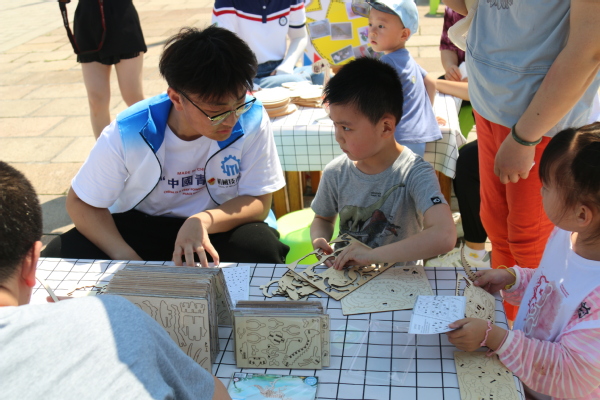学生党员们前期在校内,通过完成CAD绘图,将数据传输到激光雕刻机,采用激光雕刻切割技术完成了200多份恐龙主题的激光切割作品。在活动现场,设立展板、实物展览、拼图拼搭,通过向小朋友们、学生家长介绍作品背后的科学知识和创新成果,展示了激光加工技术的科技魅力。周丽老师介绍,在学生亲手设计与制作环节中,不仅激发了大学生的专业技能、创新意识和创造兴趣,也提高了他们的满足感与获得感,激光加工技术作为机械学院光电制造及应用技术的专业课,培养了学生对激光技术在生产加工领域的应用能力,并且通过向中小学校、社区街区普及相关的科技知识和创新成果,大大提高了大学生参与科技创新活动的热情。
