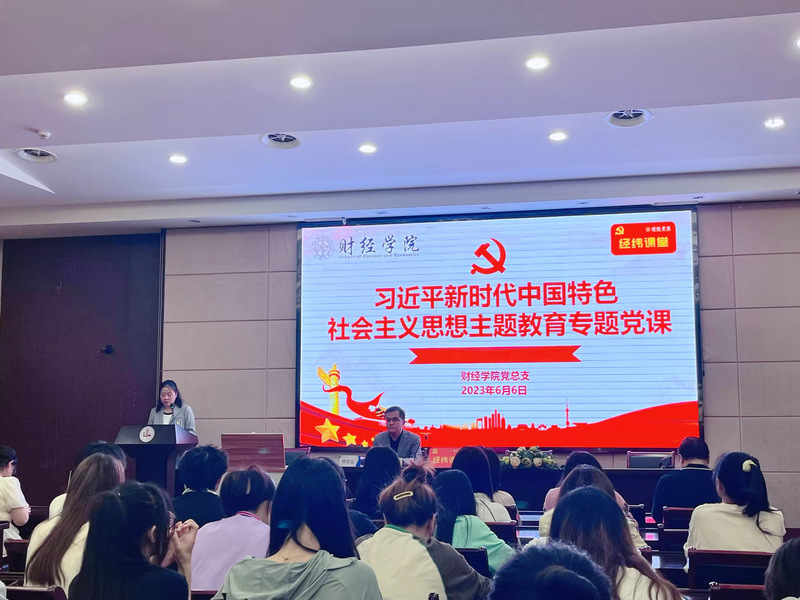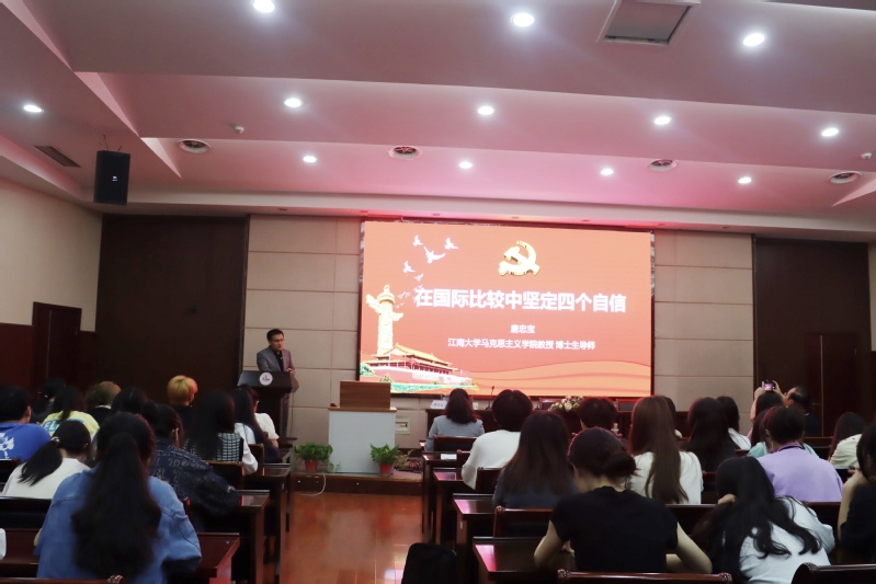 为深入开展学习贯彻习近平新时代中国特色社会主义思想主题教育,6月6日下午,财经学院党总支邀请江南大学马克思主义学院教授、副院长、博士生导师唐忠宝,在国际交流中心二楼报告厅举行“经纬课堂”第二讲—在国际比较中坚定四个自信。财经学院党总支书记李湘、师生党员及入党积极分子共70余人参加学习。