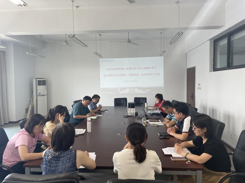为深入推进学习贯彻习近平新时代中国特色社会主义思想主题教育,7月12日,外语与旅游学院二级理论中心组在国际交流中心604会议室开展了集中学习暨“牢记嘱托、感恩奋进、走在前列”主题教育大讨论。郭再泉书记主持会议,学院二级理论中心组全体成员参加本次学习讨论会。