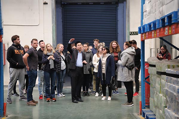 上午,在国际交流合作处与管理学院的组织安排下,师生代表团参观了我校的校企合作单位——江苏华商城市配送网络股份有限公司。代表团在物流仓库直观地了解了新一代O2O智能宅配电商系统。参观过程中,丹麦客人对智能物流管理系统非常感兴趣。