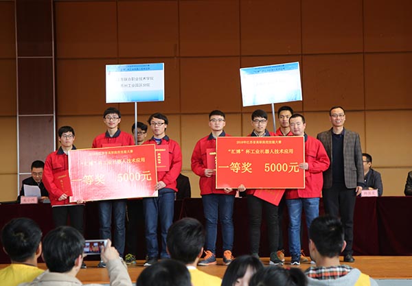工业机器人技术应用赛项则要求选手完成机械和电气安装、视觉系统编程调试、工业机器人系统编程调试、工业机器人系统模块调试以及系统综合编程调试等任务,最终评出一等奖2名、二等奖4名、三等奖6名。该赛项较去年相比内容难度增加,平台更为开放、系统功能更加完整,也更接近工业实际的应用特点。我校参赛队自去年选拔优秀学生参与集训,最终由陆荣、丁健老师指导的王军、聂阳和姜鑫同学代表学校出征,比赛当天现场发挥出色,夺得第一名,与江苏联合职业技术学院苏州工业园区分院共同获得一等奖。