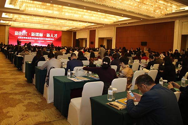 教育部职业玛雅吧 指导委员会办公室常务副主任王国川教授、教育部职业院校外语类专业教学指导委员会主任委员刁建东教授、江苏省教育厅袁靖宇副巡视员等领导先后致辞,围绕深入贯彻落实党的十九大精神、进一步发挥教育部职业玛雅吧 指导委员会作用、开展外语玛雅吧 改革研究、新时代高等教育发展的“四个服务”和“三个内在要求”等问题进行了阐述。
