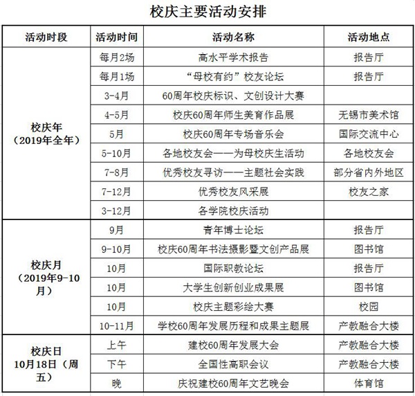 甲子回首,一代代无锡职院人接续奋斗,谱写了学校发展的辉煌篇章。为了更好地总结办学历史、展示办学成果、凝聚各方力量、提升学校形象,也为了在新的起点上推进改革创新、扩大开放合作、加强内涵提升、实现跨越发展,加快建设应用技术大学步伐,我们按照“隆重、简朴、务实、创新”的原则,精心策划设计了系列校庆活动,现予以公布。