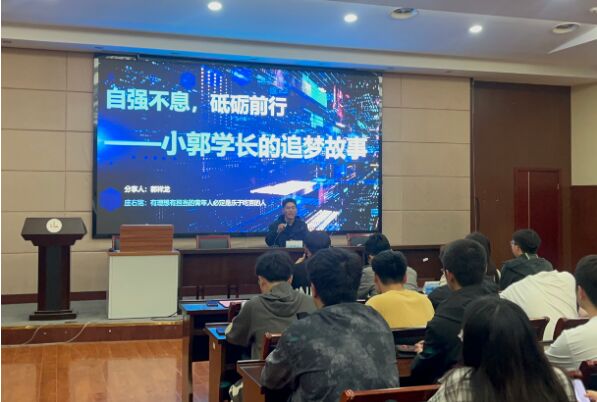 4月28日下午,汽车与交通工程学院“母校有约”校友分享会在国际交流中心二楼报告厅举行, 本次讲座邀请2023届优秀校友郭祥龙,为在校生带来了“自强不息,砥砺前行——小郭学长的追梦故事”主题分享会,学院党总支书记张美娟、副书记刘雄、辅导员和各年级学生参加。