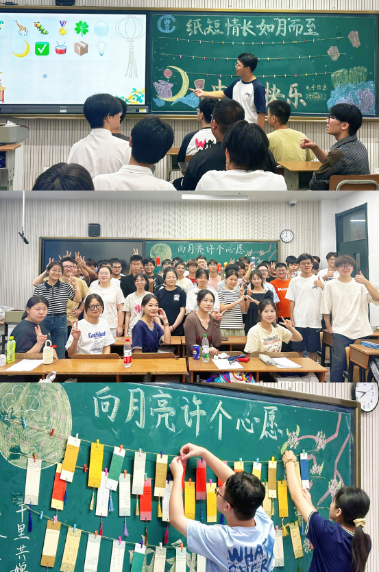 随后,集成电路学院辅导员和新生班主任走进班级,深入了解学生的学习状态和适应情况,并利用课余时间给同学们带来了一场趣味中秋活动,丰富了同学们的大学时光。传统节日凝结着中华民族的民族精神和文化情感,承载着中华民族的血脉和思想精华,此次中秋活动以学生喜爱的集体游戏融合中国传统中秋佳节元素,让每一位新生感受到“团圆”的欢乐与温暖。活动中,来自各地的同学倾情分享畅谈本地中秋习俗文化,并团结协作参与趣味游戏,展现“芯青年”朝气蓬勃、奋发有为的精神面貌,活动结束,同学们在便签纸上写下大学梦想,一张张青春的信笺承载着同学们对未来的美好愿景。