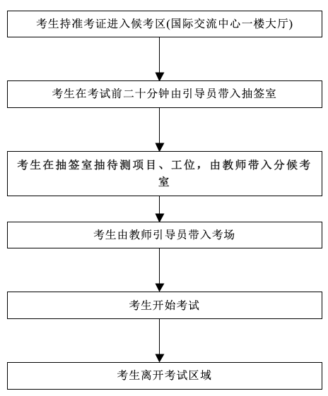 2、请所有考生按准考证上的考试时间提前30分钟进入候考区。以考生进入抽签室的时间节点为界,凡迟到15分钟及以上的考生不得参加该场考试。