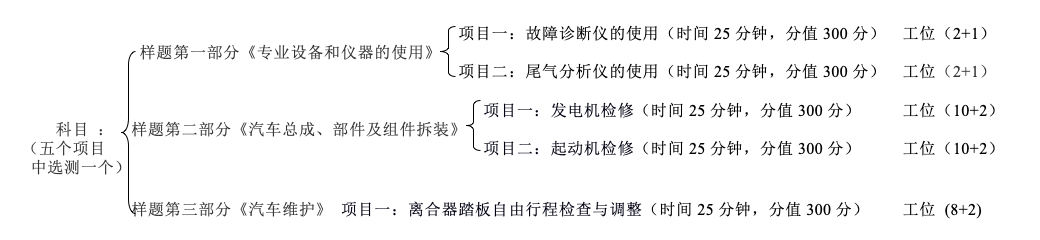 考生从样题第一部分《专业设备和仪器的使用》(两个项目)、第二部分《汽车总成、部件及组件拆装》(两个项目)、第三部分《汽车维护》(一个项目)中随机抽取一项考试。