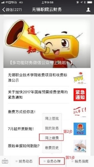 (1)扫下面二维码,关注“无锡职院云财务”公众号