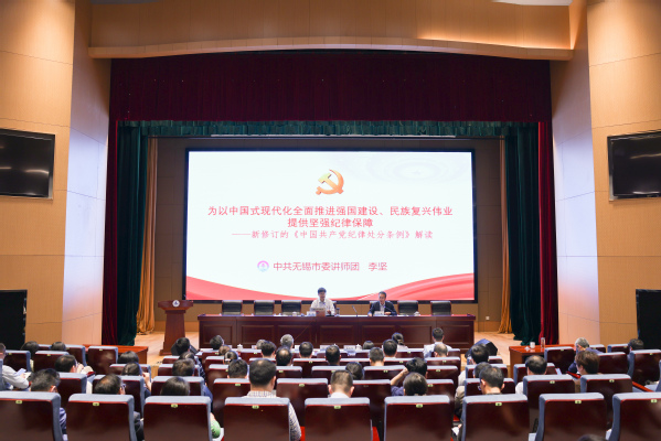 为扎实推进党纪学习教育,4月26日下午,学校在厚德楼一楼报告厅举办党纪学习教育首场专题辅导报告暨党委理论学习中心组(扩大)学习会,无锡市委讲师团三级调研员李坚受邀作专题辅导报告。党纪学习教育专题读书班全体成员、党委理论学习中心组全体成员、全体党员中层干部、学校纪委委员、二级学院纪检委员等参加学习,报告会由学校党委书记龚方红主持。