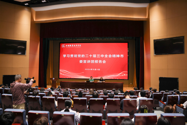9月5日下午,学校举办学习贯彻党的二十届三中全会精神市委宣讲团报告会暨开学第一堂思政大课。市委宣讲团成员,无锡市委党校教育长、校务委员周及真作主题宣讲,党委副书记杨雪琴主持报告会。学校思政教师代表、学生代表150人到场聆听。